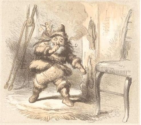 Nic zatem dziwnego, że również grubiutka postać w futrzanym kubraczku na ilustrujących poemat obrazkach F.O.C. Darleya bardziej przypomina krasnoludka niż świętego Mikołaja. Odległość od postaci ascetycznego biskupa podkreśla, również użyta już wcześniej przez Irwinga, fajka [rys. 3 i 4].