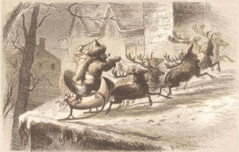 Rok później wydany anonimowo poemat „A Visit From Saint Nicholas” utrwalił w społecznej świadomości wymyśloną przez Irwinga wersję z kominem oraz rozwinął Gilleyowską koncepcję zastosowania reniferów jako napędu do sań [rys. 3] Co ciekawe, postać przedstawiona w tym poemacie zawiera wyraźne nawiązanie do niemieckiego Pelznickla. Autor opisuje go bowiem jako ubranego od stóp do głów w futra, a Pelznickel (postać występująca w niektórych rejonach Niemiec jako zastępcza dla Świętego Mikołaja, z uwagi na fakt, że po reformacji nie wypadało, by prezenty dzieciom rozdawał katolicki święty) oznacza właśnie „Mikołaj w futrach”. Prowadzona jest dyskusja, czy autorem poematu był Clement Clarke Moore (generalnie uznawany za jego autora) czy też Henry Livingston. Jednak żaden z nich nie był Niemcem, a nawiązania do tradycji niemieckich są tu dość wyraźne. Być może zatem istnieje jakaś trzecia odpowiedź? Albo autor w kosmopolitycznej Ameryce miał kontakty także z niemieckimi tradycjami? Tak czy inaczej, również w tym poemacie Mikołaj był malutki. Wątpliwości nie pozostawia poniższy fragment :